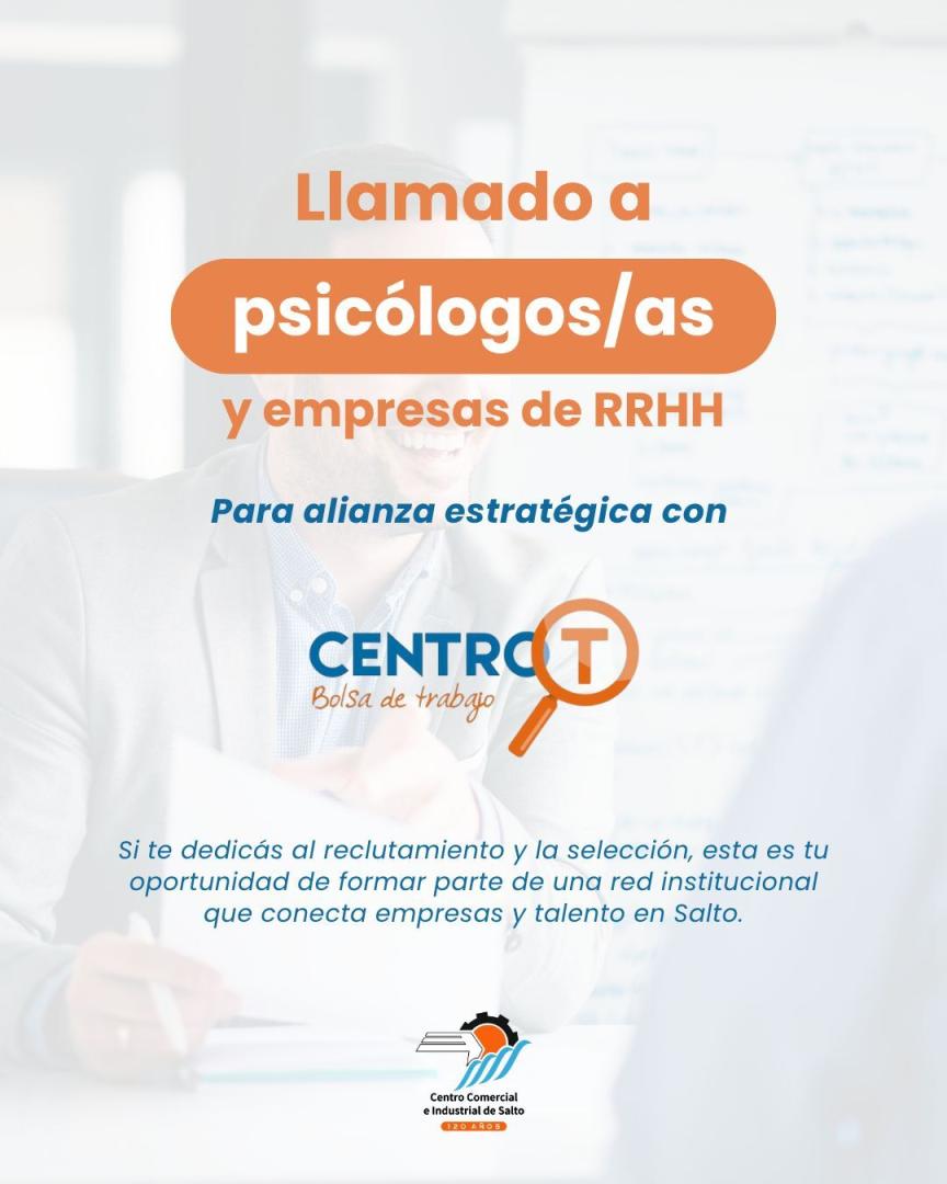 El Centro Comercial e Industrial de Salto, a través de su Bolsa de Trabajo CentroT, abre un llamado a profesionales y empresas especializadas en reclutamiento y selección de personal para integrar una red de aliados estratégicos.